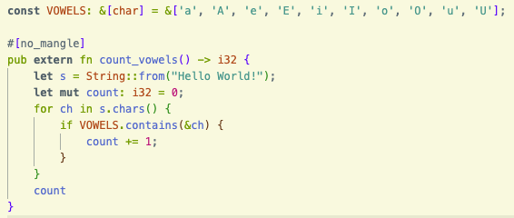 rustc count\_vowels.rs \--target=wasm32-unknown-unknown \--crate-type=cdylib \-C opt-level=0 \-C debuginfo=0 \-o count\_vowels.wasm
